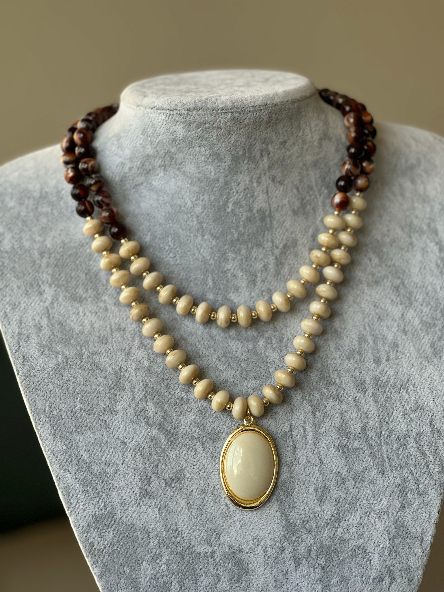 Krem Kahve Oval Detay Boncuk Kolye